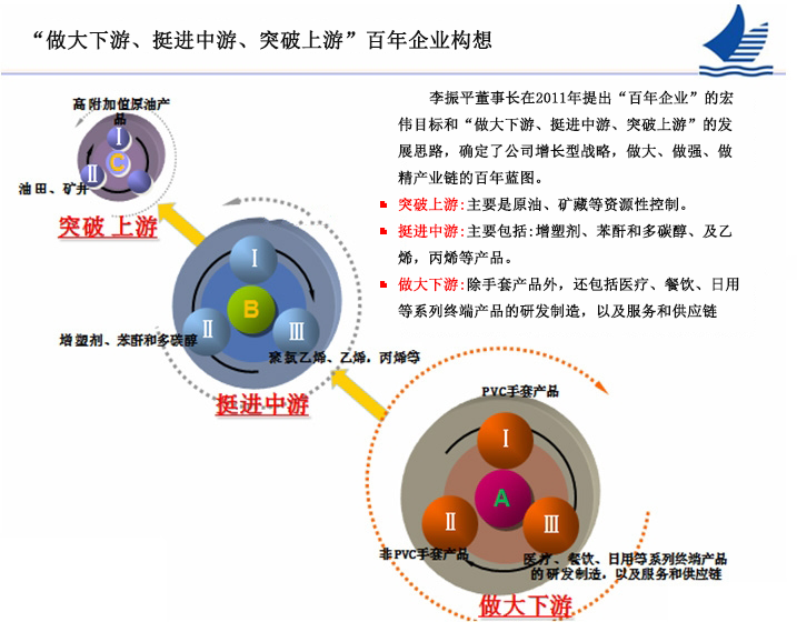 The “Group industrial value chain competition” thought, in detail, refers to “enlarge downstream, advance in middle-stream, break through upstream and fulfill the golden industry chains”. That is to form an industrial pattern: upstream product is the strong support for downstream plastic products and downstream plastic products is the important safeguard for upstream petrochemicals.